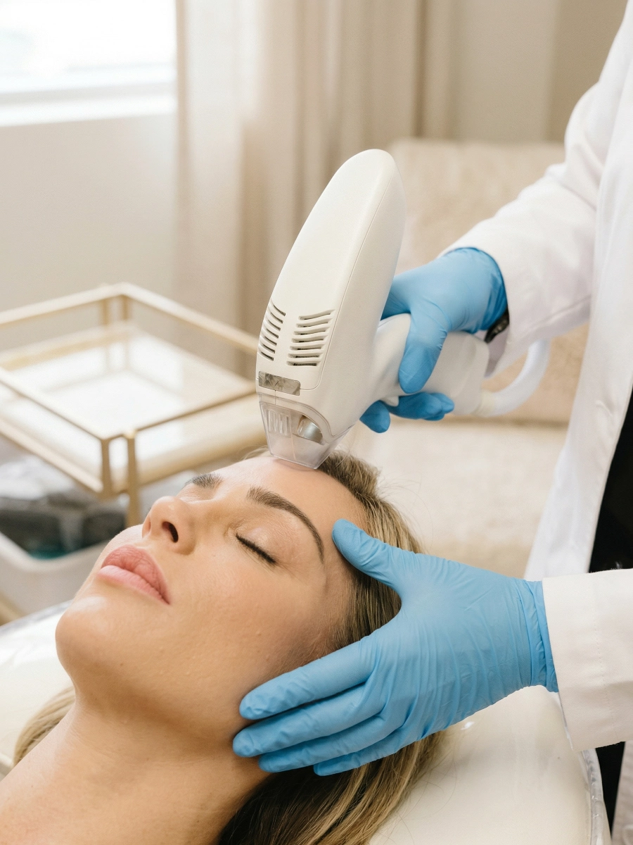 After 20-30 minutes of topical numbing, your provider applies the Tixel handpiece in a systematic stamping pattern across the treatment area. Each stamp contacts the skin for precisely controlled milliseconds. You'll feel brief warmth with each stamp — well-tolerated with numbing. Treatment takes 15-25 minutes depending on area and settings.